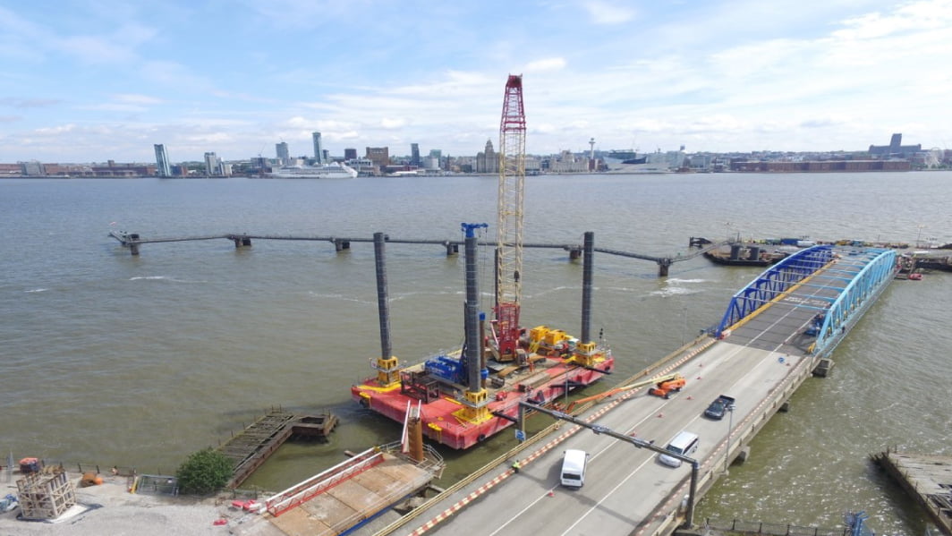 A further twelve vertical 1,219mm diameter piles were installed for the fixed bridge from a jack up barge to depths of 30m. These included a five-metre rock socket.